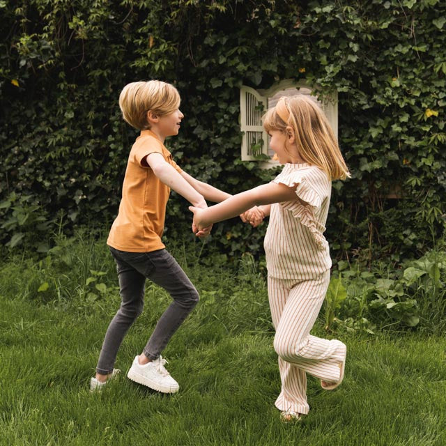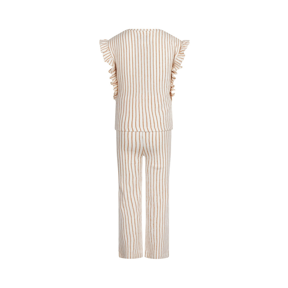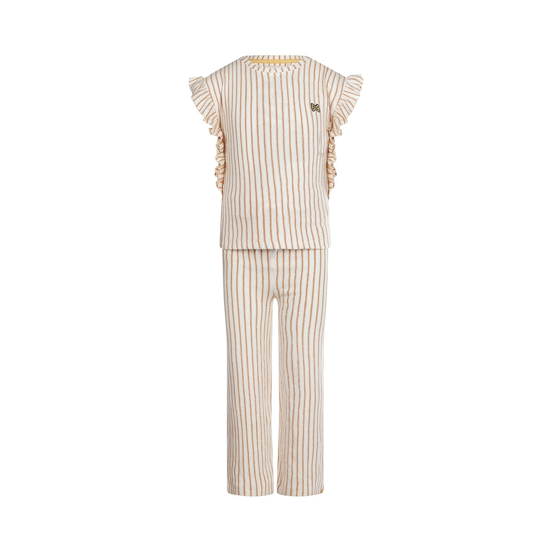 Koko Nokoスタイルで世界を発見しよう!このセットで、あなたの女の子は冒険に出かける準備ができます。Koko Nokoセットは、上質なタオル地のTシャツとワイドパンツ。トップスはオフホワイトにキャメル色のストライプ。シャツには小さな袖があり、フリルが下まで続いている。お揃いのワイドパンツはオフホワイトにキャメル色のストライプ。