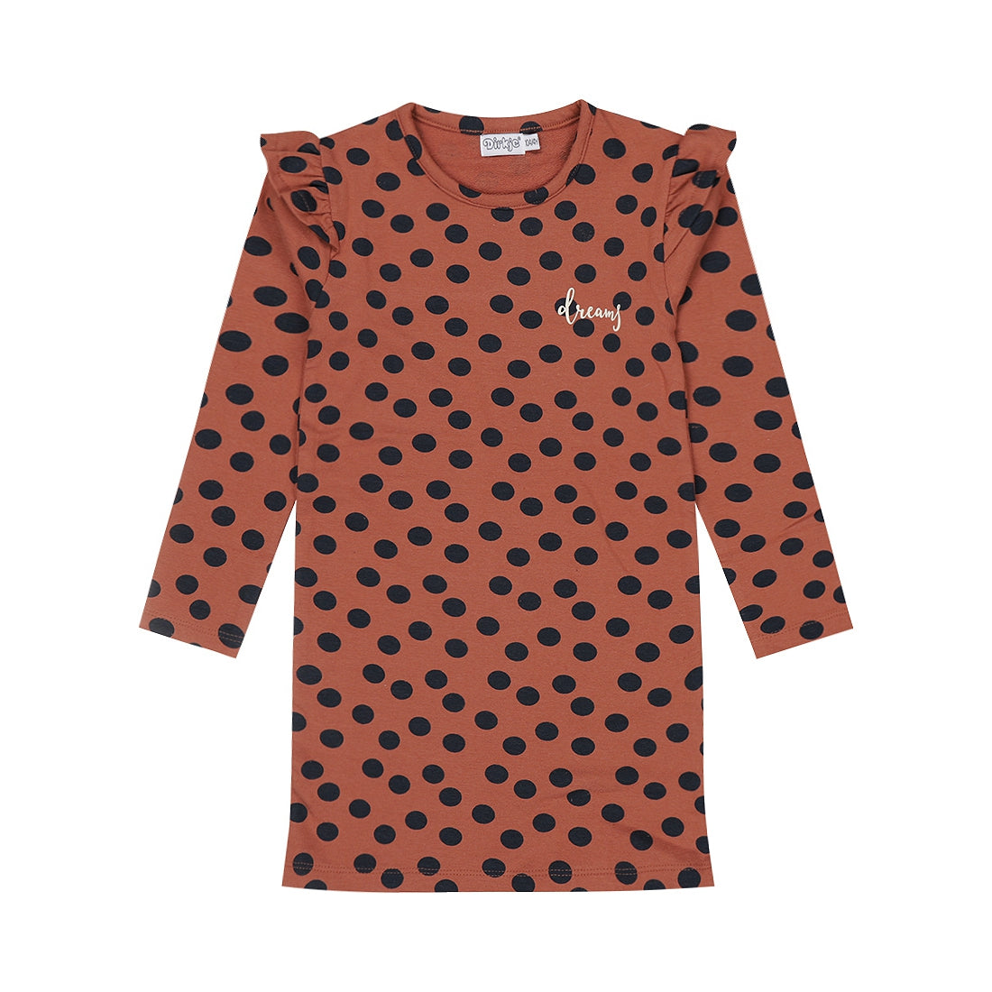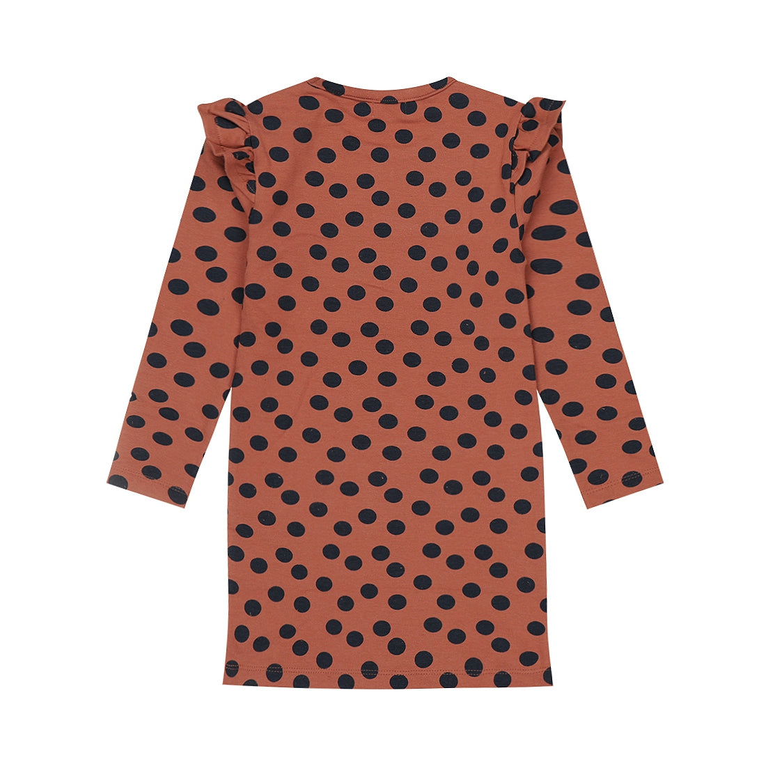 Dirkje の長袖の女児用ドレス。色はさび茶色です。ドレスの肩にはフリルが付いており、全体に水玉模様がプリントされています。