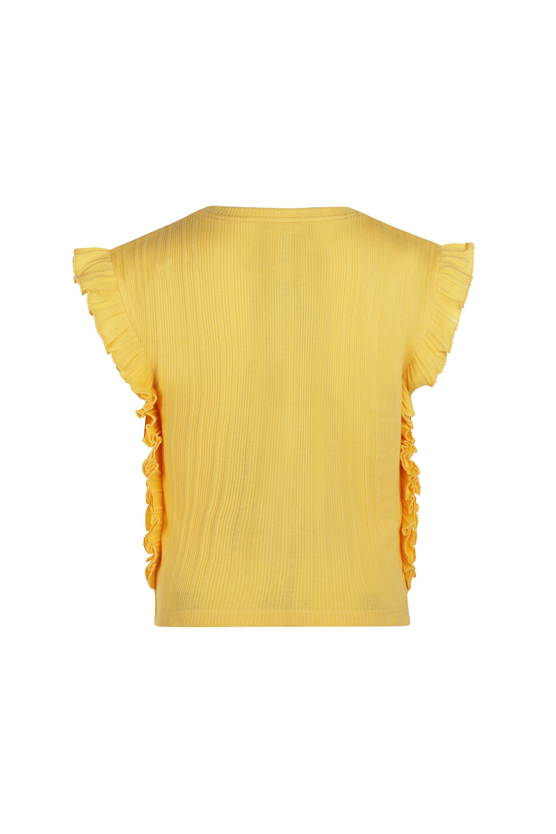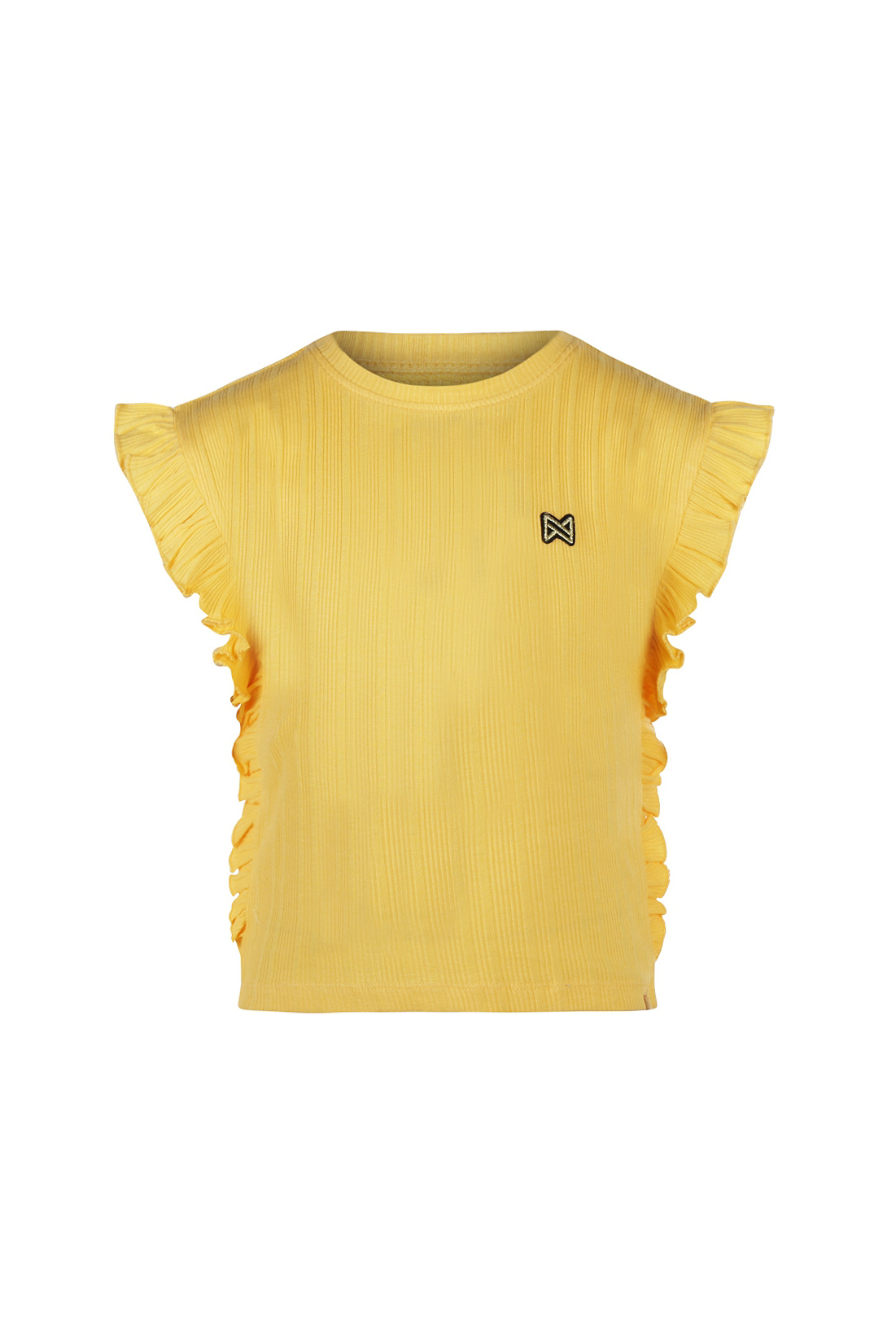 ココノコのお気に入り!このココノコトップは黄色で、リブ構造の美しい生地で作られています。女の子用のシャツには小さな袖があり、下に向かってフリルが付いています。キレイめパンツと合わせれば一気に夏気分に!